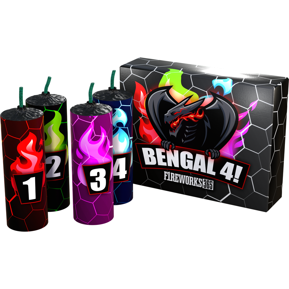 Set mit 4 Bengalischen Flammen: rot, blau, lila und grün.