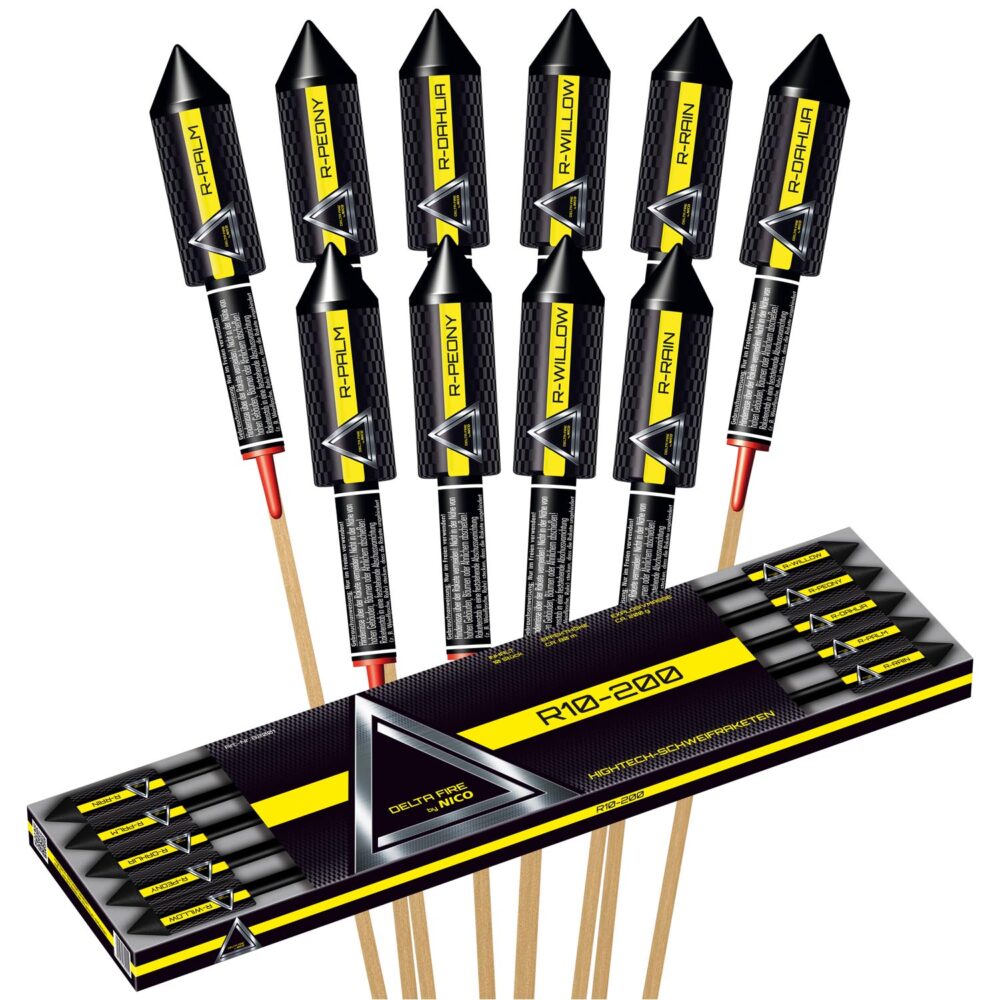 Hochwertiger Präsentkarton mit 10 großen Hightech-Schweifraketen mit maximaler Explosivmasse, 5-fach sortiert. Die Raketen steigen mit wunderschönem Silberschweif sehr hoch auf und zerlegen in einem lauten Knall zu riesigen Buketts mit einer ganz besonderen und abwechslungsreichen Effektauswahl. Neben dem Anzündstäbchen im Deckel sind folgende Raketen enthalten: